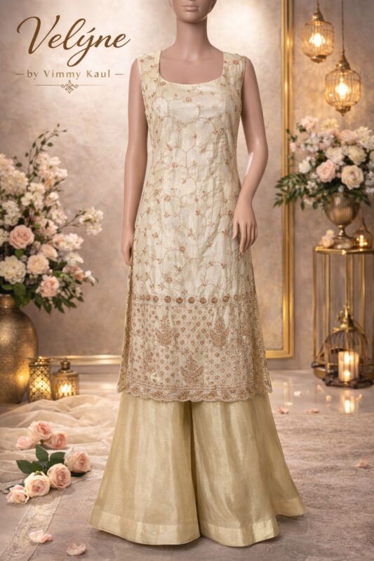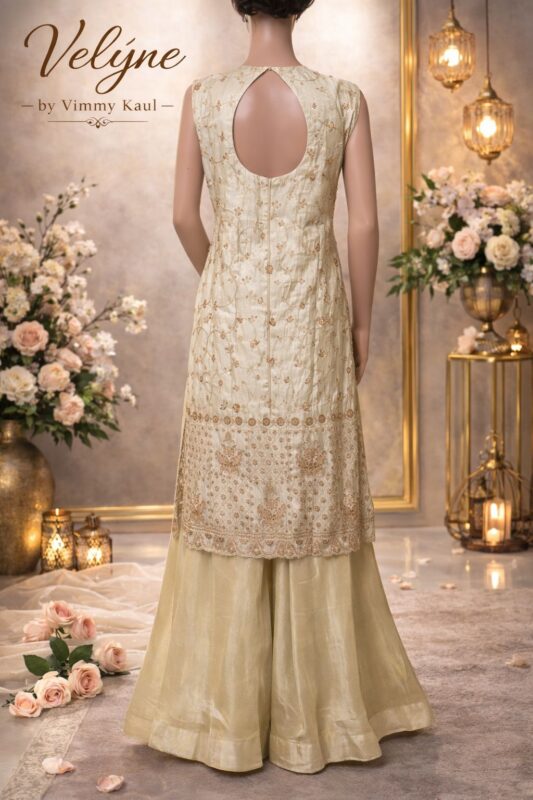 Ivory Gold Embroidered Kurta Set with Sharara & Dupatta
