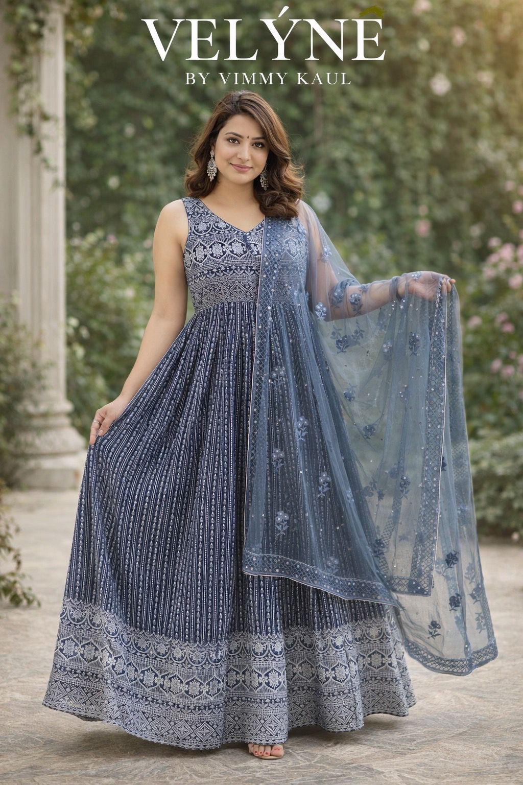 Grace meets sophistication in this stunning azure grey Anarkali set, designed for the modern woman who loves timeless elegance. Featuring intricate all-over patterns with a beautifully flared silhouette, this outfit creates a regal yet effortless look. The sheer embroidered dupatta adds a layer of delicacy, making it perfect for both festive and occasion wear.