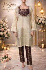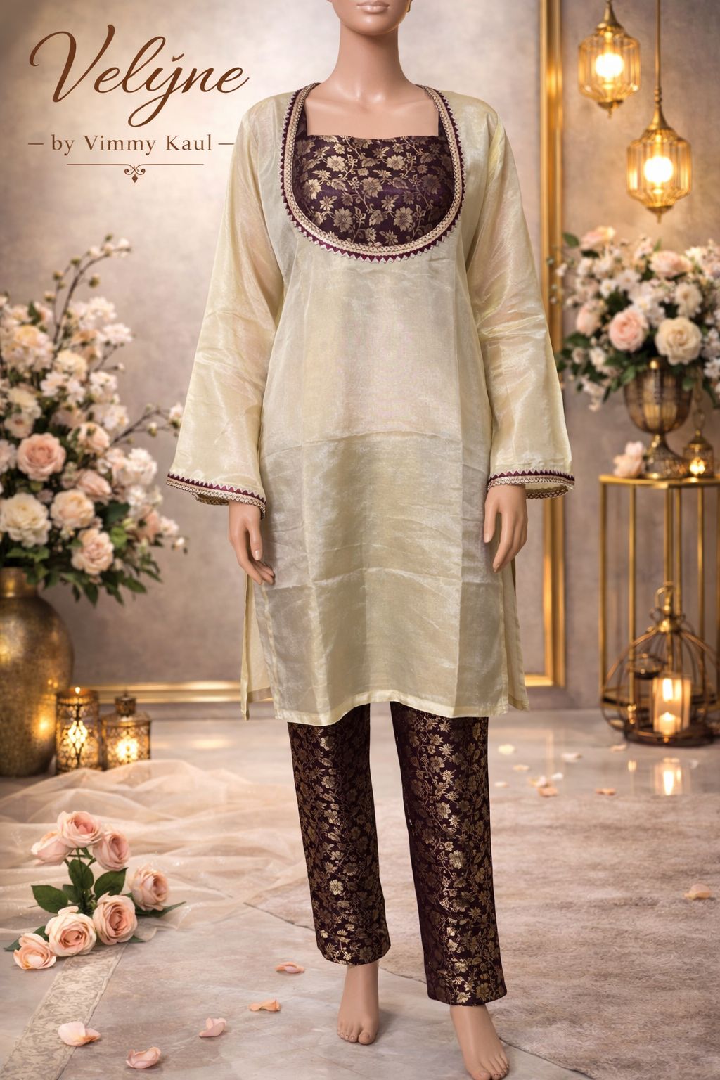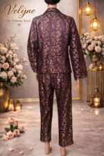 The rich wine-toned brocade fabric with intricate gold floral motifs creates a regal look, while the soft ivory overlay kurta adds balance and grace to the outfit. Each piece can be styled together or separately, offering versatility for multiple occasions.
