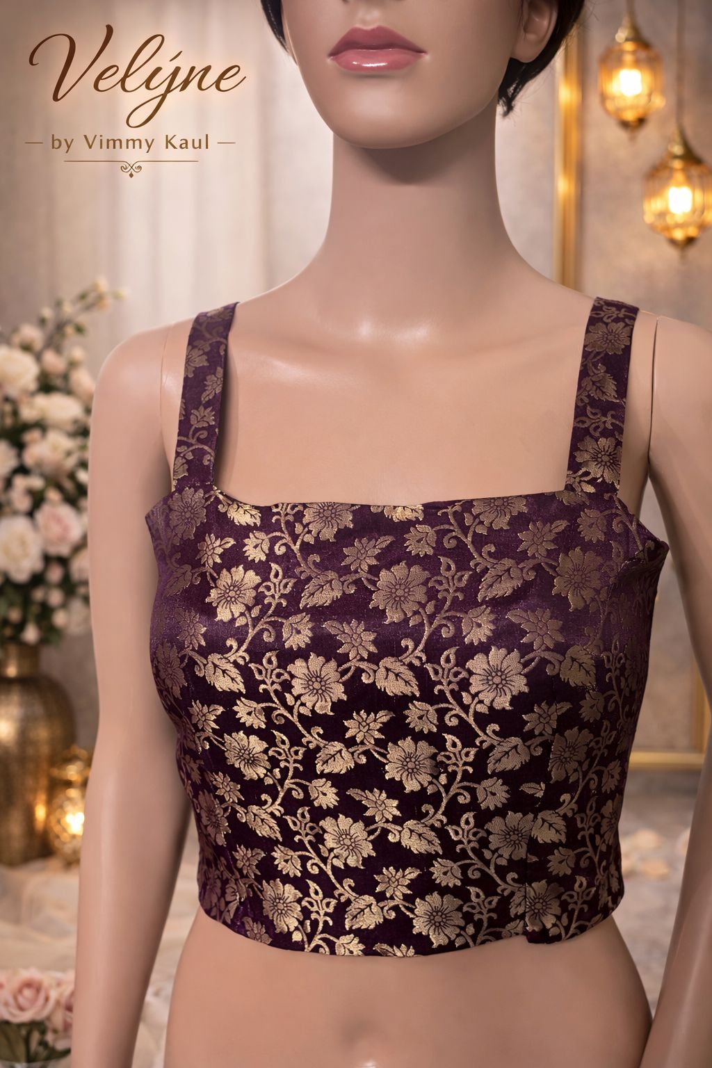 * Decorative neckline border complementing the brocade bustier
